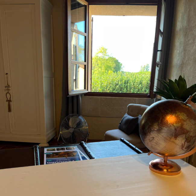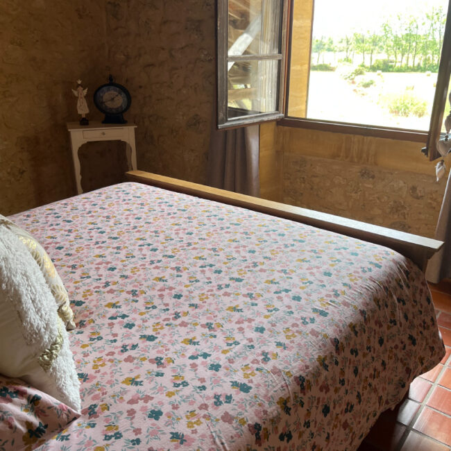 Devenus périgourdins de cœur en 2019, nous avons choisi cette vie au calme dans un cadre enchanteur, après avoir été de vrais citadins. Nos filles et nous partageons l’amour de ce lieu que nous chérissons et nous espérons que vous l’apprécierez à votre tour. Nous sommes profondément attachés à cette terre. Le projet de gîte était ancré en nous depuis de nombreuses années, il fallait trouver le lieu qui nous ressemble. Nous y sommes ! Avec le souci de bien faire, afin de vous apporter toujours plus de confort, pour vous accueillir et vous permettre de passer un vrai moment ressourçant dans notre hameau. Nous vous souhaitons la bienvenue sur notre site internet et au plaisir de vous recevoir dans notre gîte aux portes du Périgord pour découvrir ce magnifique territoire chargé d’histoire.Chambre parentale vue piscine avec bureau